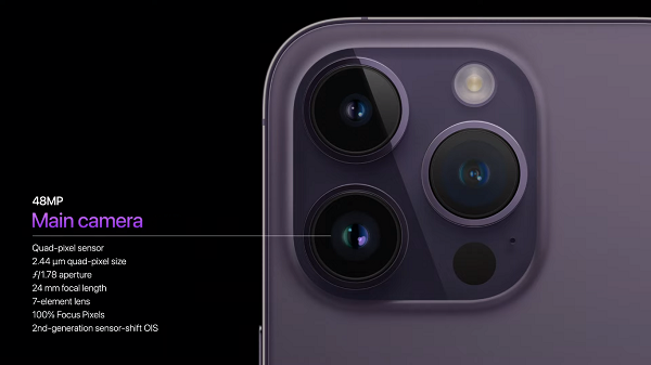 Dòng iPhone 14 thế hệ mới sử dụng ống kính 6 thành phần, khẩu độ f/1.8. Ngoài ra, hai phiên bản Pro và Pro Max sẽ được Apple trang bị camera Wide 48 megapixel (MP) do Sony chế tạo thay vì camera 12 MP như trước cùng tính năng hỗ trợ quay video 4K đỉnh cao.