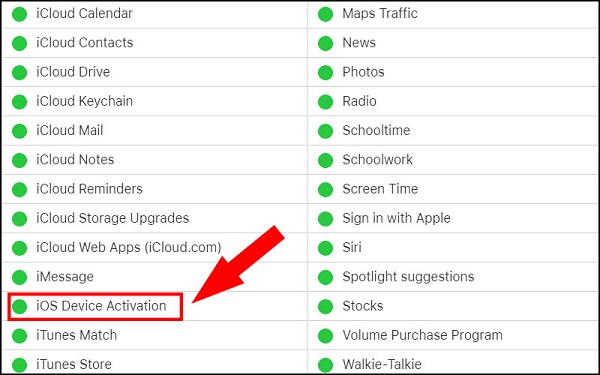 Để kiểm tra, người dùng cần tiến hành truy cập vào trang System Status của Apple và xem thử tính năng “Kích hoạt thiết bị iOS” đã được bật ở chế độ màu xanh lá hay chưa. Nếu như tính năng hiện không có sẵn và vẫn đang hiển thị màu vàng, người dùng chỉ cần chờ một lúc để máy chủ Apple tiến hành khắc phục. Sau khi Apple đã xử lý xong, người dùng lúc này đã có thể kích hoạt iPhone của mình.
