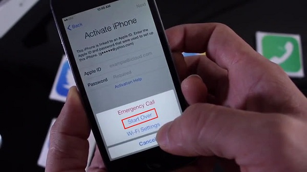 Nhấn nút Home cho tới khi xuất hiện tùy chọn Emergency Call, Start Over và Wifi Settings >> chọn Start Over để làm mới lại thiết bị. Người dùng hãy nên thử cách này từ 3 lần trở lên