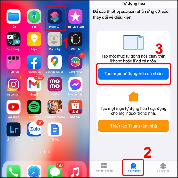 Mở Shortcuts > Chọn tab Tự động hóa (Automation) > Nhấn Tạo mục tự động hóa cá nhân (Create Personal Automation).