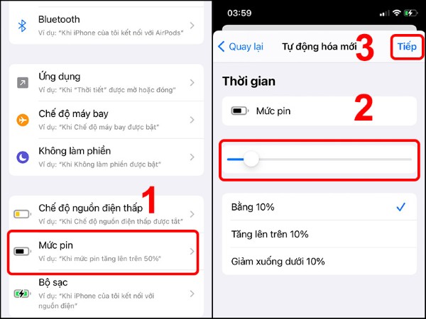 Chọn Mức pin (Battery Level) > Điều chỉnh mức pin mà bạn muốn nhận thông báo, ví dụ 100% > Nhấn Tiếp (Next).