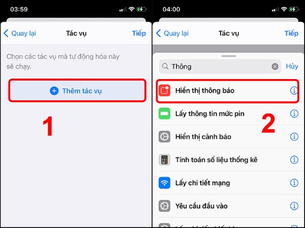 Nhấn Thêm tác vụ (Add Action) > Gõ “hiển thị thông báo” hoặc “Show Notification” vào ô tìm kiếm > Chọn đúng mục hiển thị.