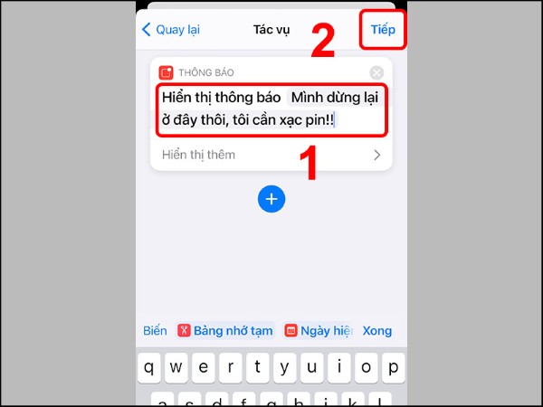 Nhập nội dung thông báo tùy ý, ví dụ “Pin đã đầy! Vui lòng rút sạc.” > Nhấn Tiếp.