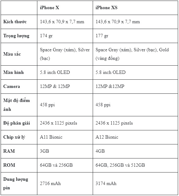 1. Bảng so sánh thông số kỹ thuật iPhone X và Xs