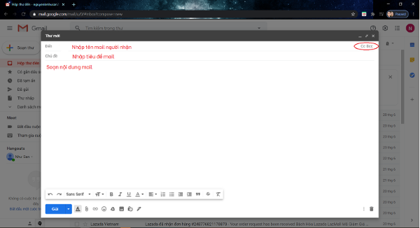 Truy cập Gmail > Đăng nhập vào tài khoản Gmail của bạn > Nhấn vào mục Soạn thư > Điền địa chỉ Email của người nhận > Chọn Chủ đề Email > Soạn nội dung Email > Có thể định dạng văn bản, đính kèm tệp,.. bằng hàng công cụ có vị trí ở phía dưới cùng > Chọn thực hiện Gửi > Xong.