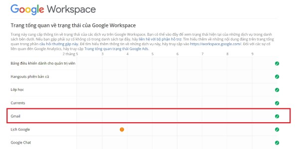 Bước 2: Kiểm tra đến ngày hiện tại và so với mục Gmail, nếu có dấu tick màu xanh lá cây nghĩa là hoạt động bình thường. Trường hợp nếu xuất hiện dấu chấm than màu cam nghĩa là Gmail bị tạm ngừng hoạt động. Nếu gặp phải lỗi này thì bạn hãy đợi Google khắc phục nhé.