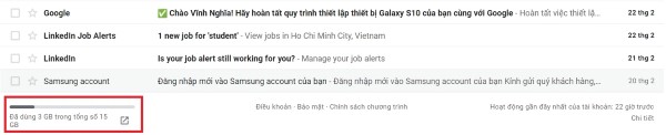 Mặc định thì tài khoản Google sẽ được cấp dung lượng lưu trữ miễn phí là 15GB và Gmail sẽ sử dụng mức dung lượng này lưu trữ. Trường hợp bạn sử dụng hết dung lượng miễn phí thì sẽ dẫn tới hiện tượng không nhận được thư mới. Để kiểm tra dung lượng miễn phí còn lại, bạn hãy truy cập vào Gmail trên trình duyệt web và kéo xuống phía dưới, để xem mức dung lượng đã sử dụng.