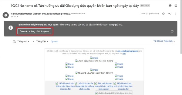 Bước 2: Tìm và chọn đến email cần tìm > Chọn vào Báo cáo không phải là spam và email đó sẽ được chuyển vào mục hộp thư đến.