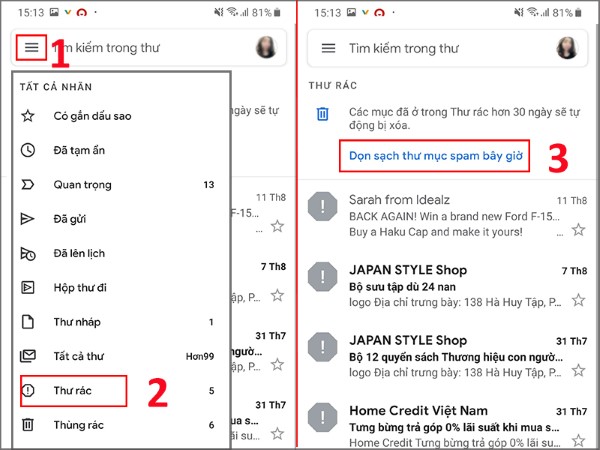 Bước 3: Sau khi báo cáo spam, email sẽ được chuyển vào mục Thư rác. Bạn có thể mở thư mục này với thao tác sau: Chọn vào biểu tượng dấu ba gạch ngang ở vị trí bên góc trái > Chọn Thư rác > Chọn vào mục Dọn sạch thư mục spam nếu muốn xóa bỏ chúng (Các thư lưu trong Thư rác sẽ tự động bị xóa sau thời gian 30 ngày).