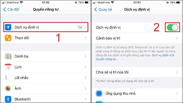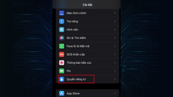 Bước 2: Chọn tiếp mục Quyền riêng tư > nhấn vào mục Dịch vụ định vị.