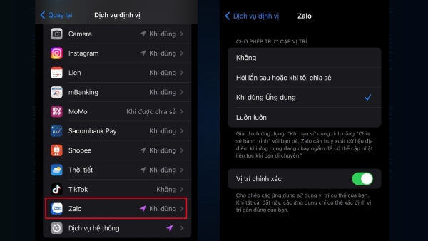 Bước 3: Tìm đến ứng dụng Zalo > cho phép ứng dụng có quyền truy cập vào vị trí của bạn. Sau đó bạn chọn tùy chọn “Khi dùng ứng dụng” để kích hoạt tính năng Tìm quanh đây trên Zalo thông qua tính năng định vị vị trí.