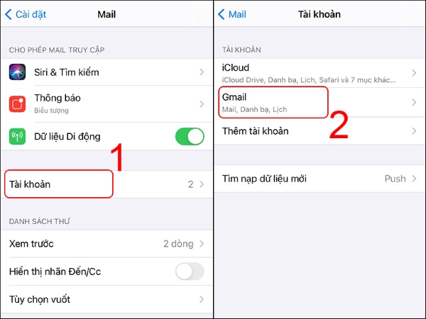 Bước 2: Chọn tiếp vào Tài khoản (Account) > chọn mục Gmail.