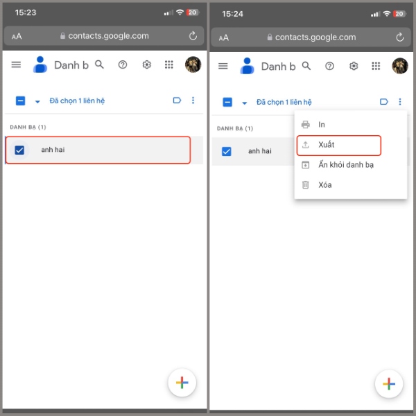 Bước 2: Chọn tên danh bạ muốn chuyển > chọn vào dấu 3 chấm > nhấn chọn Xuất.