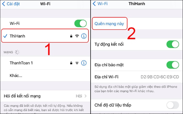 Bước 2: Nếu lỗi kết nối được mạng vẫn chưa được khắc phục, bạn nhấn vào tên WiFi đang sử dụng > chọn Quên mạng này > tiến hành kết nối lại mạng.