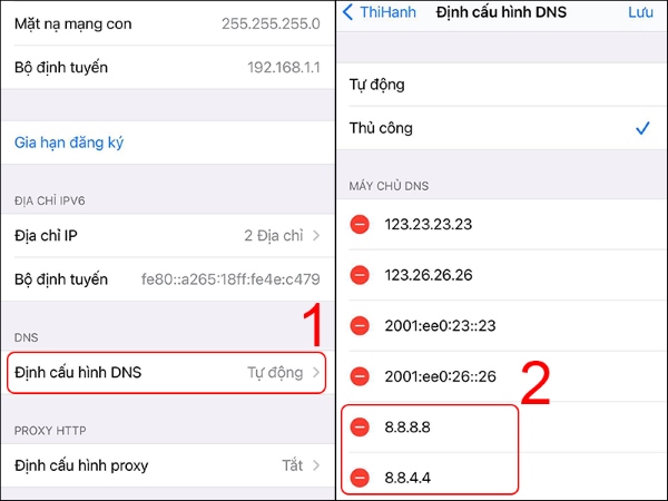 Bước 3: Ngoài ra, bạn cũng nên thay đổi địa chỉ DNS cho mạng WiFi đang sử dụng trên iPhone bằng cách: Nhấn vào tên WiFi đang sử dụng > chọn Định cấu hình DNS thành Thủ công > tiến hành thêm DNS của Google là 8.8.8.8 và 8.8.4.4.