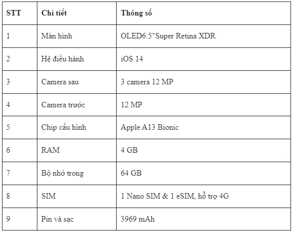 Dưới đây là bảng chi tiết thông số kỹ thuật trên iPhone 11 Pro Max: