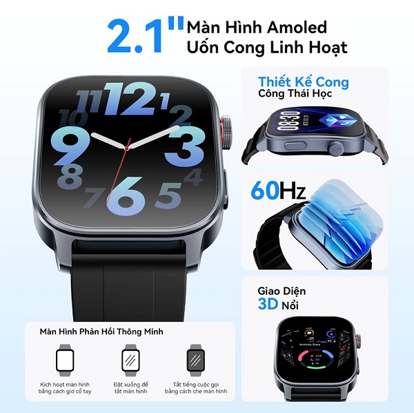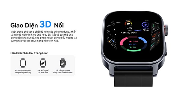 Kết hợp với phong cách thiết kế tinh tế, đồng hồ thông minh Kieslect KS3 sở hữu màn hình AMOLED 2.1 inch với độ phân giải Full HD, mang lại trải nghiệm hiển thị sắc nét, rõ ràng cùng cảm ứng “siêu nhạy”. Người dùng có thể dễ dàng kết nối trực tiếp với tai nghe Bluetooth, đồng thời sử dụng các cử chỉ thông minh như vuốt, lướt để điều khiển các tính năng một cách thoải mái và tiện lợi trên giao diện 3D nổi của Kieslect KS3.
