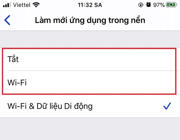 Bước 2: Bạn chọn ô Làm mới ứng dụng trong nền > chọn một trong 2 tính năng là Tắt (vô hiệu hóa tính năng) và Wi-Fi (chỉ cho phép chạy nền với kết nối Wi-Fi).