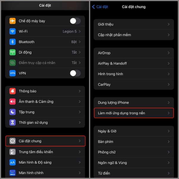 Bước 1: Mở Cài đặt > chọn Cài đặt chung > chọn tiếp mục Làm mới ứng dụng trong nền.