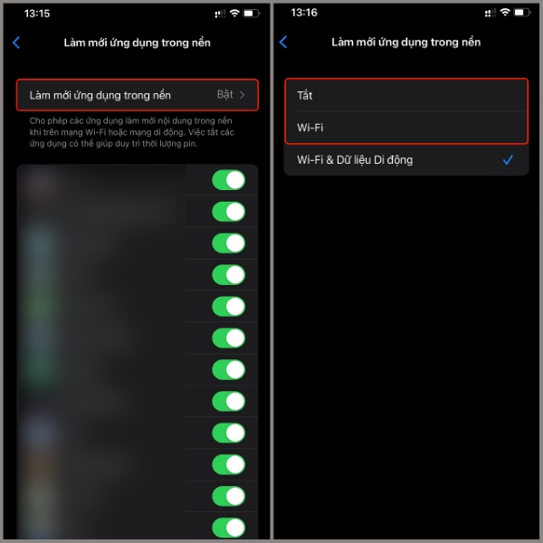 WiFi & Dữ liệu di động: Tính năng sẽ làm mới ứng dụng trong nền bằng WiFi. Và khi không có WiFi, tính năng sẽ tiếp tục làm mới ứng dụng bằng dữ liệu 3G/4G mà thiết bị đang kết nối.