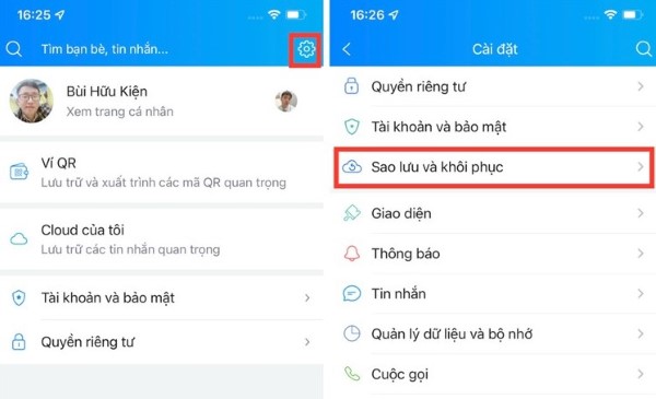 Bước 2: Chọn tiếp vào Cài đặt (biểu tượng bánh răng) > Vào Sao lưu và khôi phục.