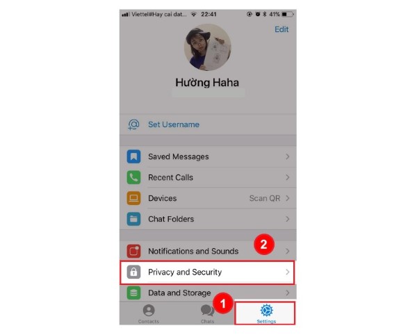 Bước 1: Truy cập ứng dụng Telegram > Chọn vào mục Settings (có biểu tượng hình bánh xe răng cưa) > Chọn tiếp đến phân mục Privacy and Security.