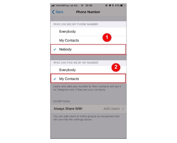 Bước 3: Ở giao diện kế tiếp hiện ra tại mục Who can see my phone number chọn cài đặt trạng thái Nobody (Không ai cả) > Tại mục Who can find me by my number > Chọn cài đặt trạng thái My contacts (Người trong danh bạ).