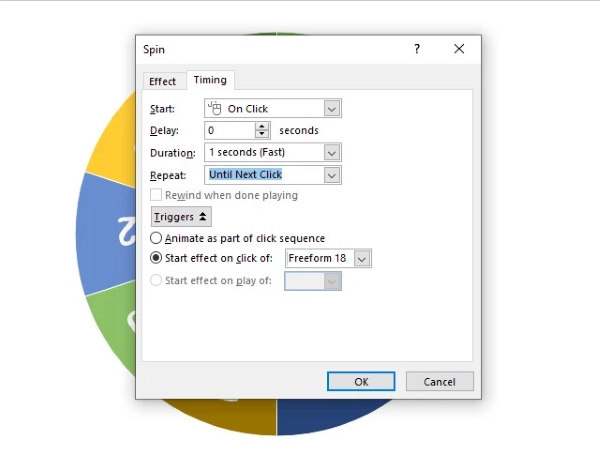 Triggers: Chọn Start effect on click of > chọn Freeform 18 > nhấn OK.