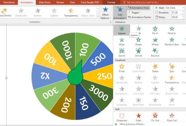 Bước 4: Tiếp theo để vòng quay may mắn dừng khi bạn nhấp chuột vào vòng tròn, hãy vào thẻ Animations > chọn Add Animation > chọn Appear hoặc bất kì hiệu ứng trong nhóm Entrance.