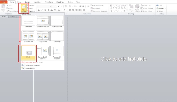 Bước 1: Nhấn vào mục New slide và nhấn Blank để tạo một slide trắng trên PowerPoint.