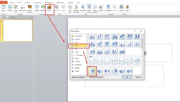 Bước 2: Tiếp theo để tạo vòng quay, bạn chọn tab Insert > Chart > Pie.