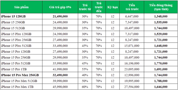 (*) Mức trả trước tối thiểu phụ thuộc vào từng sản phẩm trong danh sách. Liên hệ trực tiếp tại điểm bán để thực hiện hợp đồng.
