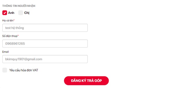 – Bước 5: Điền thông tin người nhận của bạn (Họ tên, số điện thoại và emal). Chọn ĐĂNG KÝ TRẢ GÓP. Tổng đài viên sẽ liên hệ lại với bạn để xác nhận thông tin đặt hàng trong 30 phút.