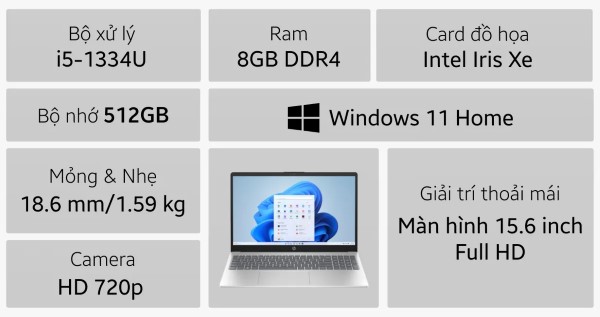 HP 15-fd0237TU là lựa chọn phù hợp cho những ai cần laptop văn phòng giá rẻ nhưng hiệu năng không thua kém các dòng cao cấp. Máy sử dụng chip Core i5-1334U, RAM 8GB và SSD 512GB, đủ sức xử lý các công việc hàng ngày. Thiết kế mỏng nhẹ cùng tông màu bạc trang nhã khiến chiếc laptop này thêm phần nổi bật.