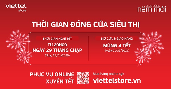 - Đối với siêu thị Viettel Store tuyến thành phố, thị xã: Từ 20h00 ngày 29 tháng Chạp (Ngày 28/01/2025).