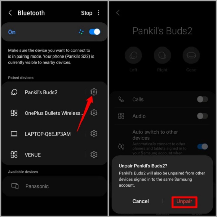 Bước 2: Chọn vào biểu tượng bánh răng bên cạnh thiết bị kết nối Bluetooth rồi nhấn chọn Unpair. Nhấn lại 1 lần nữa vào Unpair để xác nhận hủy ghép nối.