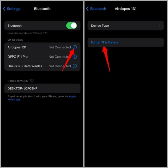 Bước 2: Nhấn vào chữ “i” bên cạnh thiết bị ghép nối Bluetooth -> chọn vào “Forget This Device” để hủy ghép nối.
