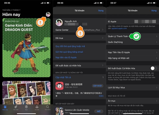 Bước 2: Mở App Store trên iPhone/iPad > nhấn vào biểu tượng hình đại diện ở góc trên bên phải giao diện ứng dụng > vào mục Tài khoản (có Tên & địa chỉ Email) ở đầu danh sách > chọn Quản lý thanh toán.