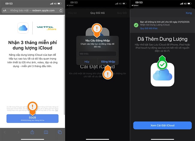 Các thao tác đăng ký nhận miễn phí 3 tháng gói dung lượng 50GB iCloud như sau: