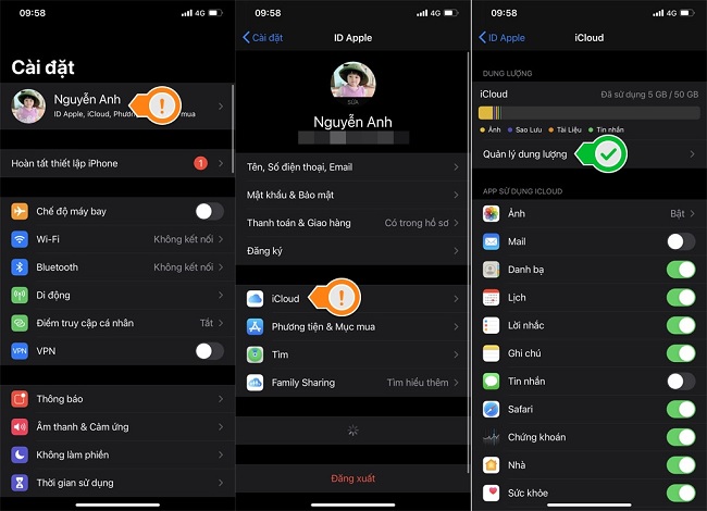 - Bước 1: Truy cập Cài đặt > ID Apple (ở đầu danh sách) > chọn mục iCloud > vào Quản lý dung lượng