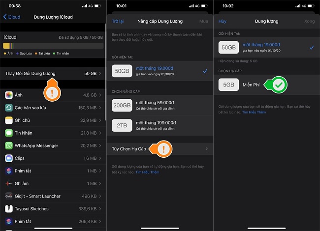 - Bước 2: Trong Quản lý dung lượng bạn chọn Thay đổi gói dung lượng và tiến hành Tùy chọn hạ cấp về gói dung lượng 5GB miễn phí là xong.