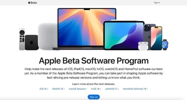 Bước 1: Trên máy Mac của bạn, mở trình duyệt Safari và truy cập trang Chương trình phần mềm Beta của Apple. Nhấn vào nút Đăng ký và đăng nhập bằng Apple ID của bạn hoặc chọn Đăng nhập nếu bạn đã tham gia trước đó.