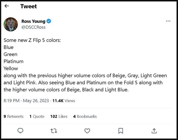 Theo chia sẻ của CEO của Display Supply Chain Consultants (DSCC) – ông Ross Young: Samsung Galaxy Z Flip5 sẽ có ít nhất 4 tùy chọn màu sắc mới. Và đó là những màu sắc: Váng, Xanh lá, Bạc và Xanh dương. Chưa hết, vị này còn cho biết thêm: Z Flip5 cũng sẽ có thêm một số tùy chọn màu sắc khác là: Hồng nhạt, Xám, Xanh lá nhạt và Beige.