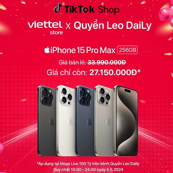 Bạn biết tin gì chưa? 10h00 sáng ngày 05/05, Mega livestream tiktok cùng Quyền Leo Daily nằm trong chuỗi sự kiện “Đại tiệc sinh nhật Viettel Store – Tròn 18, sale trọn tháng, trúng ngàn quà” sẽ chính thức diễn ra trên nền tảng TikTok Shop của Quyền Leo Daily và Viettel Store. Tại siêu sự kiện này, khách hàng sẽ đón nhận hàng loạt deal khủng, giá sốc lên áp dụng với iPhone 15 Pro Max chính hãng, iPad gen 9 Wifi, Xiaomi Robot.