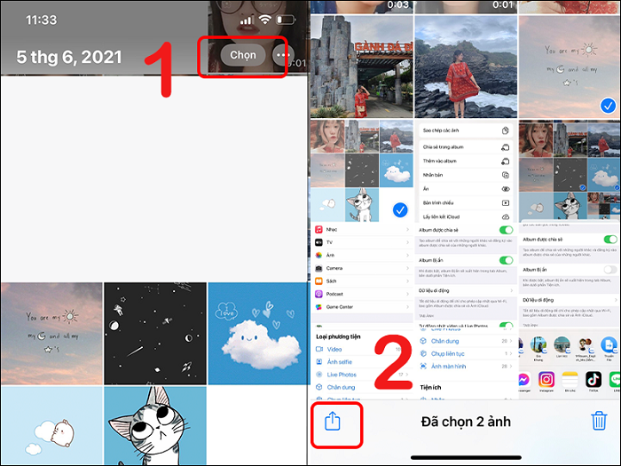 Sau đó, bạn bấm vào nút Chọn ở góc bên phải màn hình và chọn các hình ảnh muốn ẩn, rồi nhấn vào nút Chia sẻ ở góc trái màn hình.