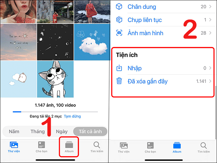 Ngoài ra, bạn cũng có thể kiểm tra lại bằng cách truy cập vào ứng dụng Ảnh và chọn Album rồi kiểm tra nếu xem mục Bị ẩn không còn xuất hiện tại phần Tiện ích là bạn đã thành công.