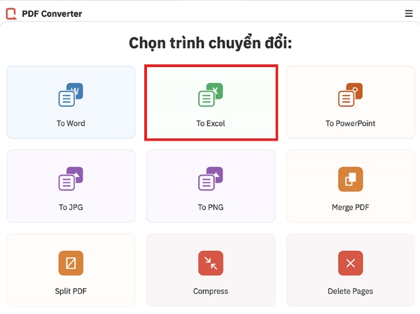Bước 2: Sau khi tải file PDF lên website > chọn trình chuyển đổi to Excel.