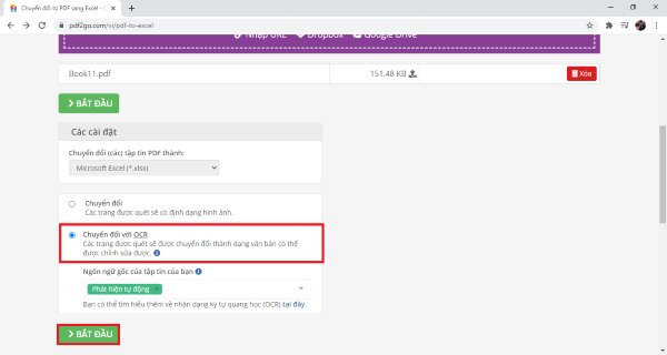 Bước 3: Với 2 lựa chọn chuyển đổi PDF, người dùng có thể chọn cách chuyển thông thường hoặc nâng cao với khả năng quét ký tự trong tệp PDF chuyên nghiệp hơn và bạn hoàn toàn có thể chỉnh sửa văn bản sau khi chuyển đổi. Sau đó nhấn Bắt đầu để chuyển đổi PDF sang Excel.