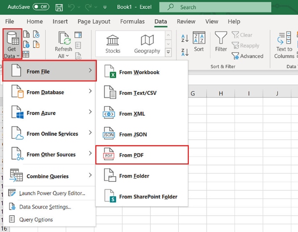 Bước 2: Nhấn vào Get Data > chọn From File > chọn From PDF.
