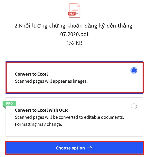 Bước 2: Sau khi tải file PDF cần chuyển đổi lên web > bạn chọn Convert to Excel > chọn Choose option.